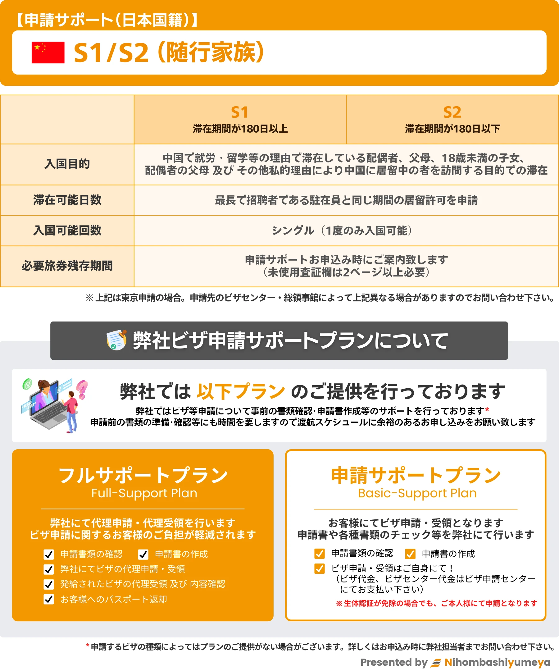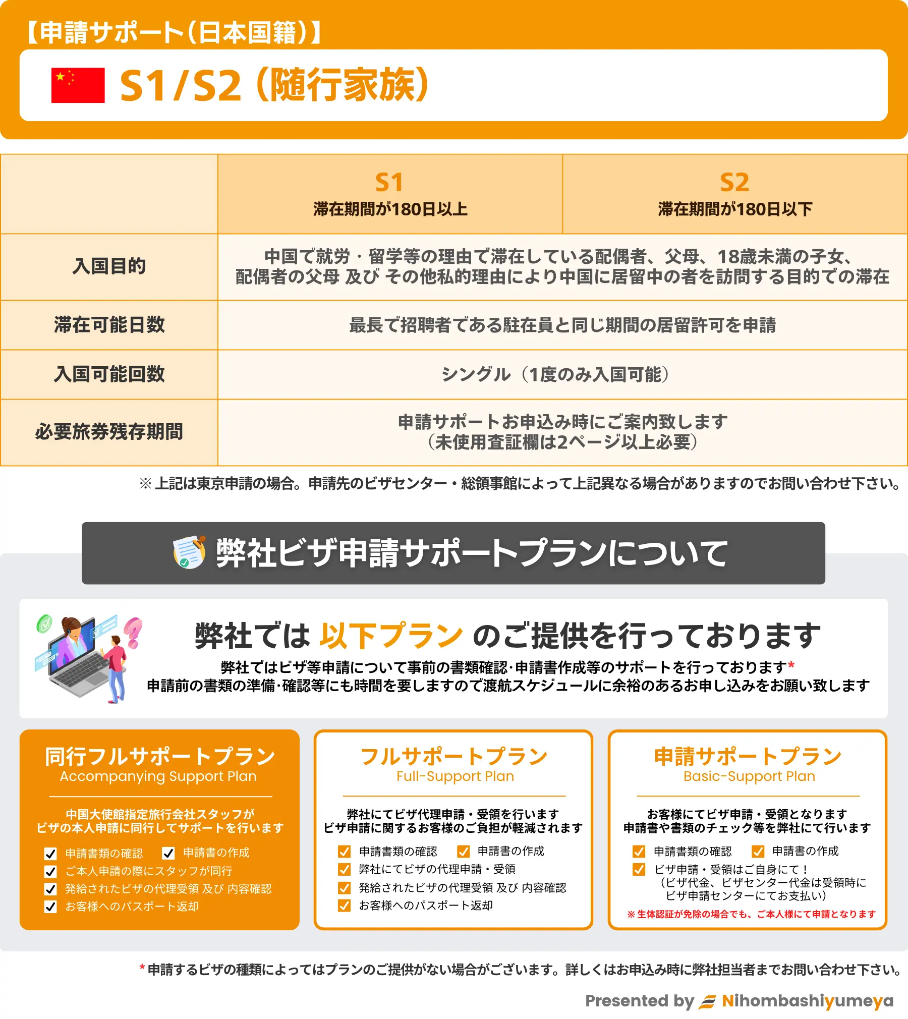 弊社では中国随行家族ビザ(S1/S2)申請サポートを下記の通り行っております。
