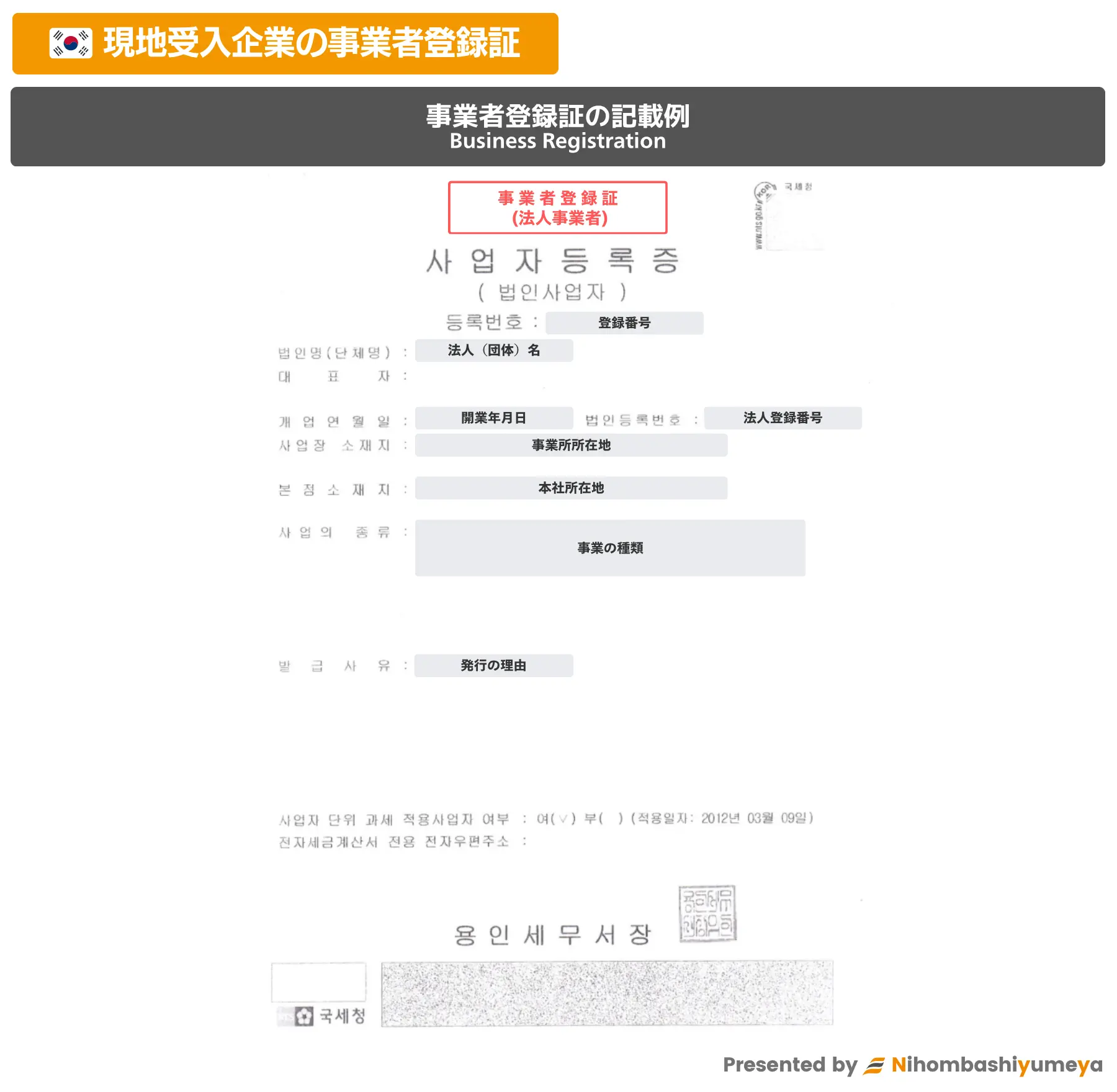5 | 在職証明書(英語または日本語) | 原本 Certificate of Employment 発行から3か月以内のもの 在職証明書への必須記載事項がありますのでお申込時にご確認下さい ※ 会社代表者が申請する場合は不要ですが、その場合登記簿謄本が必要となります (なお韓国語でも申請可能ですが弊社で内容の確認ができません) |