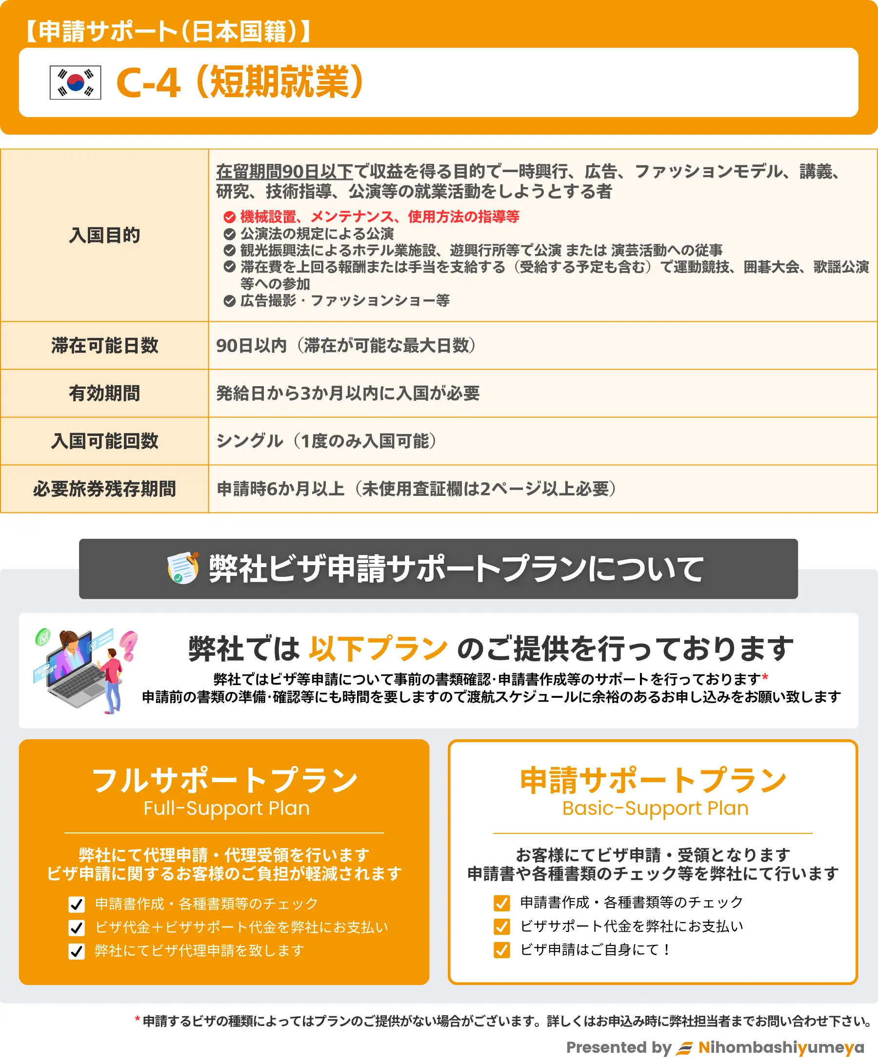 弊社では韓国短期就業ビザ申請サポートを下記の通り行っております。