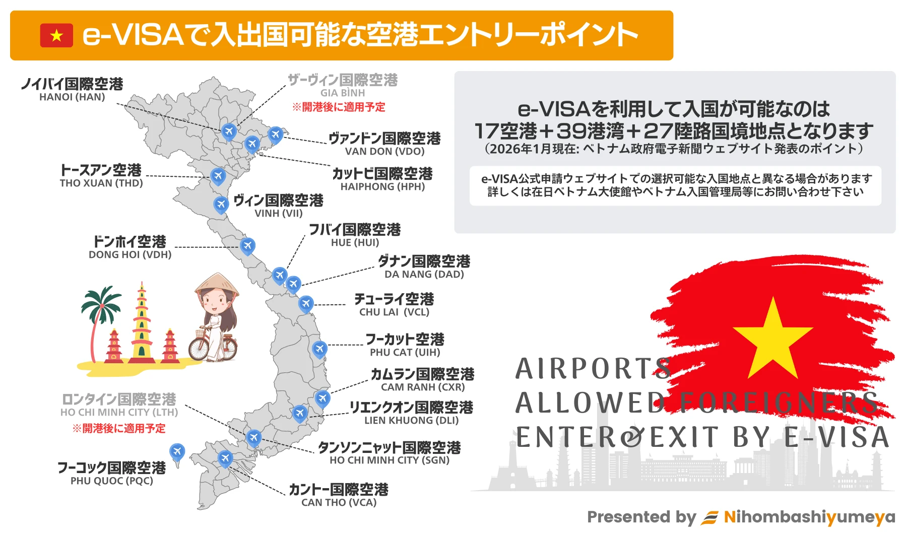 2026年1月現在、e-VISAを利用して出入国が可能な空港は以下の17空港となります。