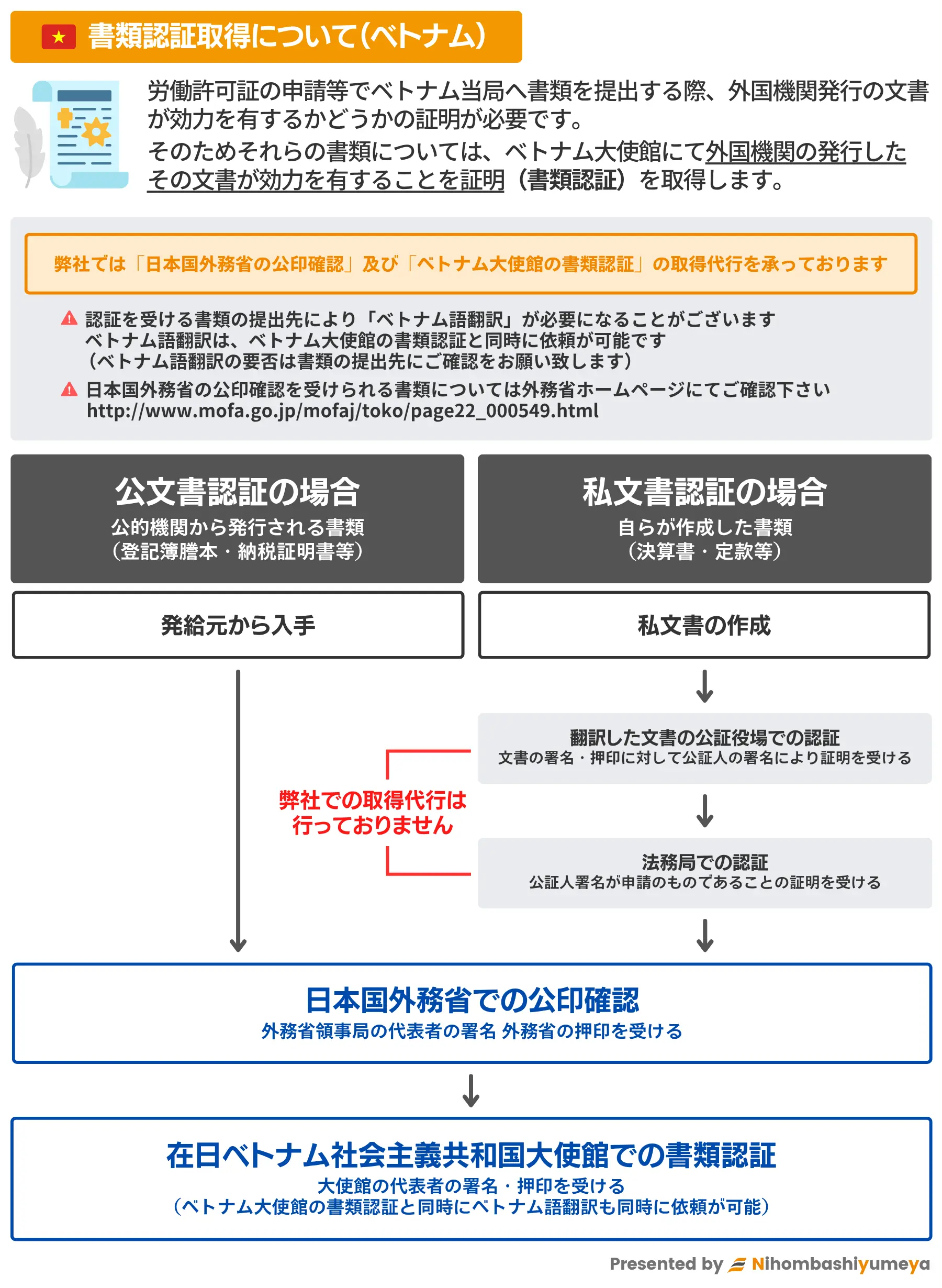 弊社ではベトナム書類認証取得サポートを下記の通り行っております。