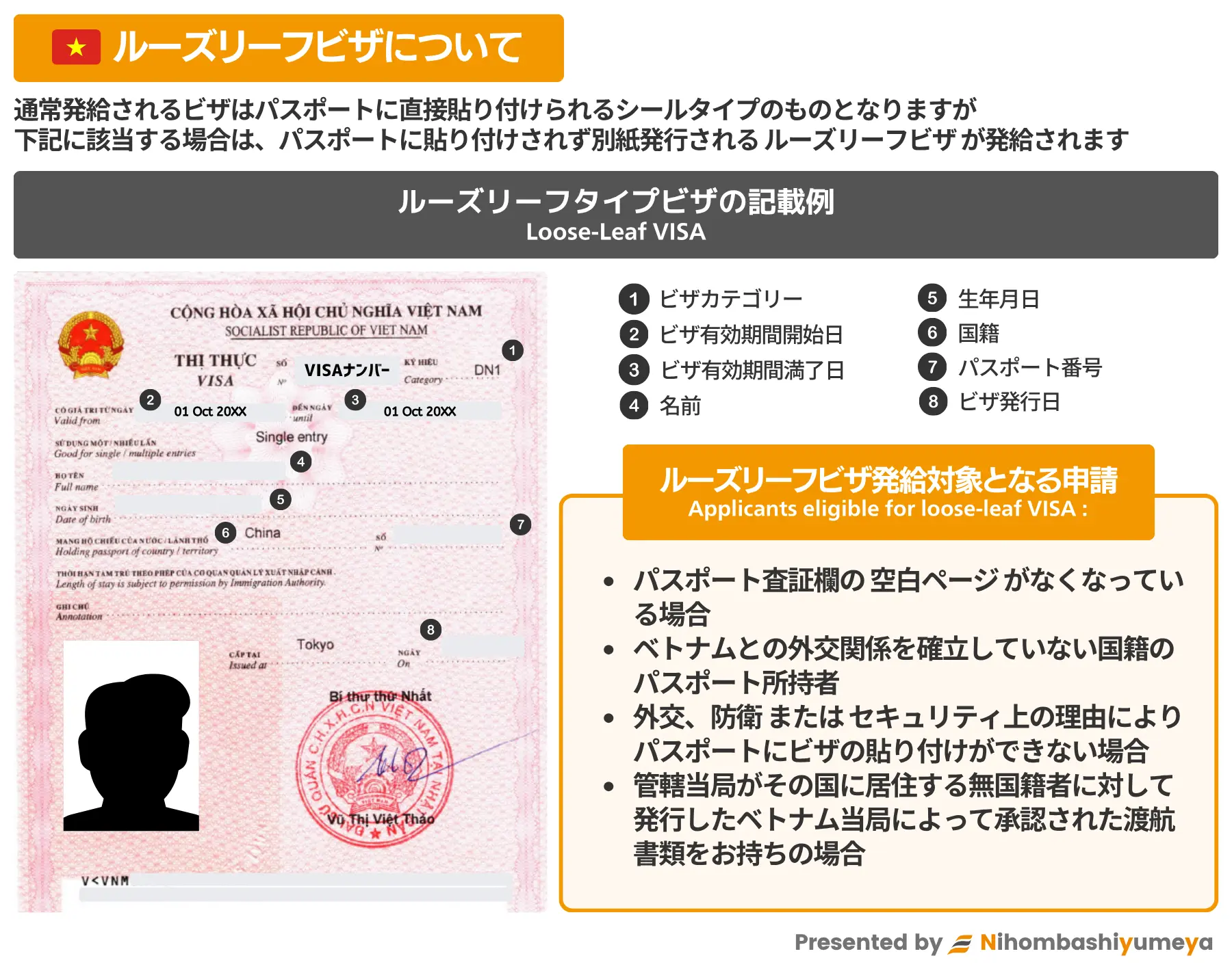 手続や規則に関する最新の情報については、駐日ベトナム社会主義共和国大使館、ベトナム公安省入国管理局等にご確認ください。