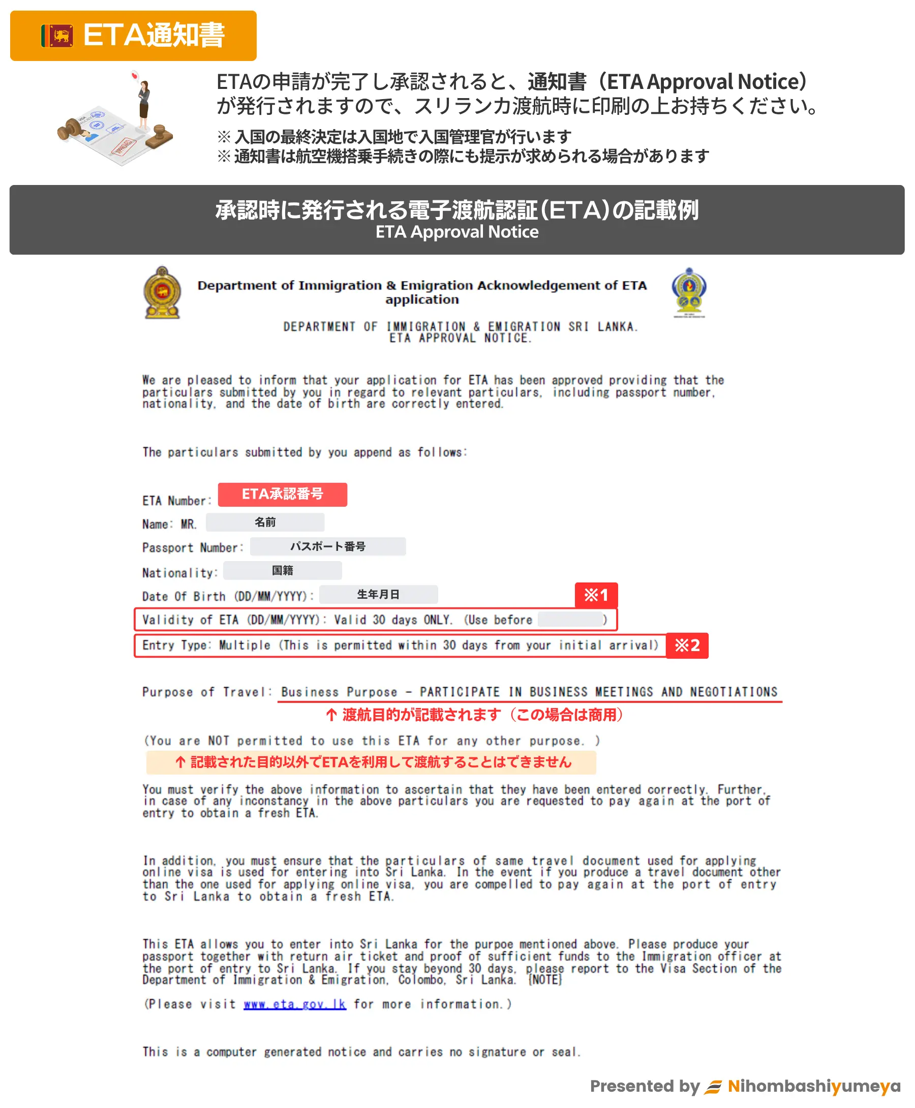 通知書をメールでお送り致しますので、スリランカ渡航時に印刷の上ご持参下さい。