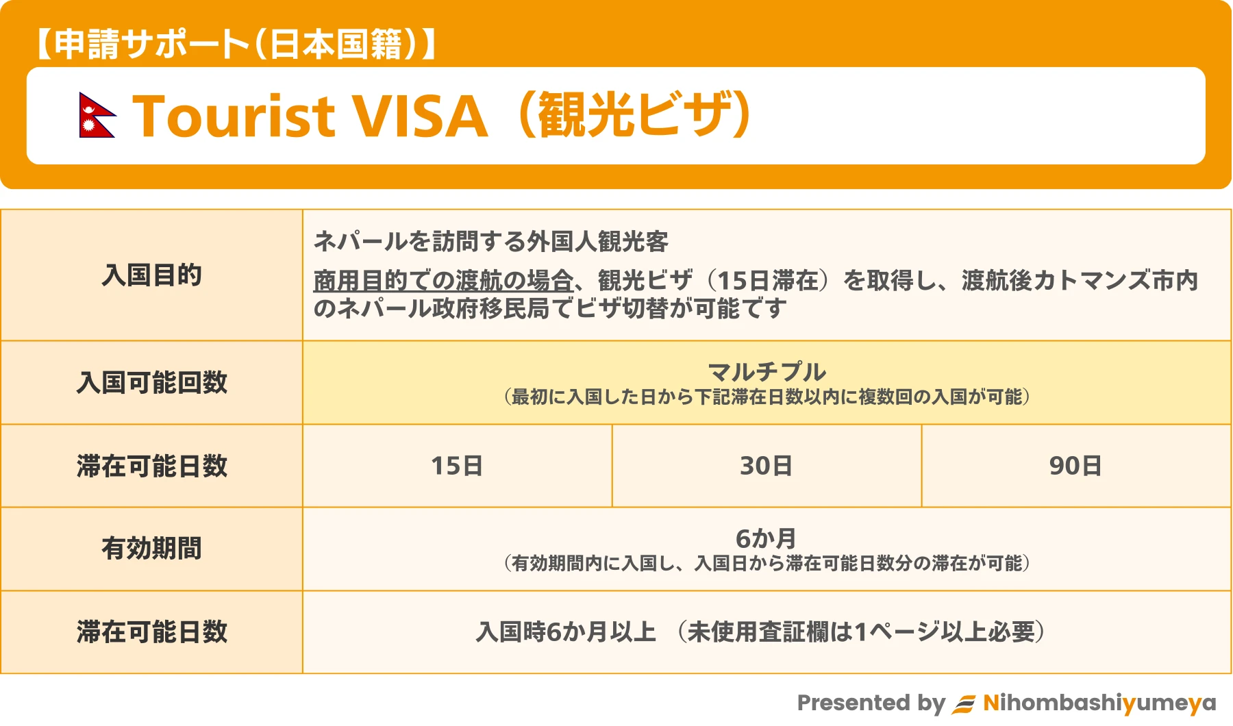 弊社ではネパール観光ビザ申請サポートを下記の通り行っております。