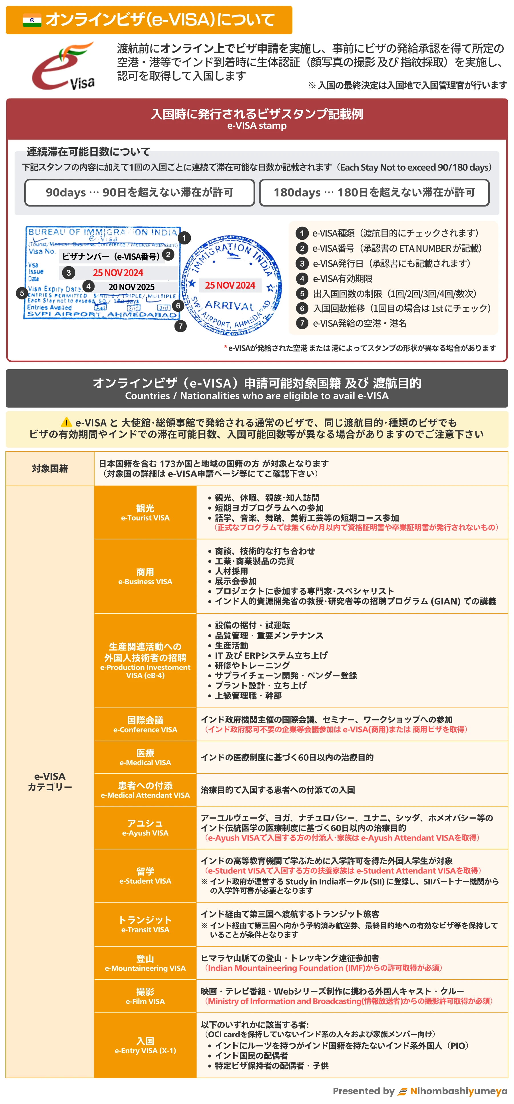 手続や規則に関する最新の情報については、駐日インド共和国大使館・総領事館、インド内務省入国管理局ウェブサイト等もご確認ください。