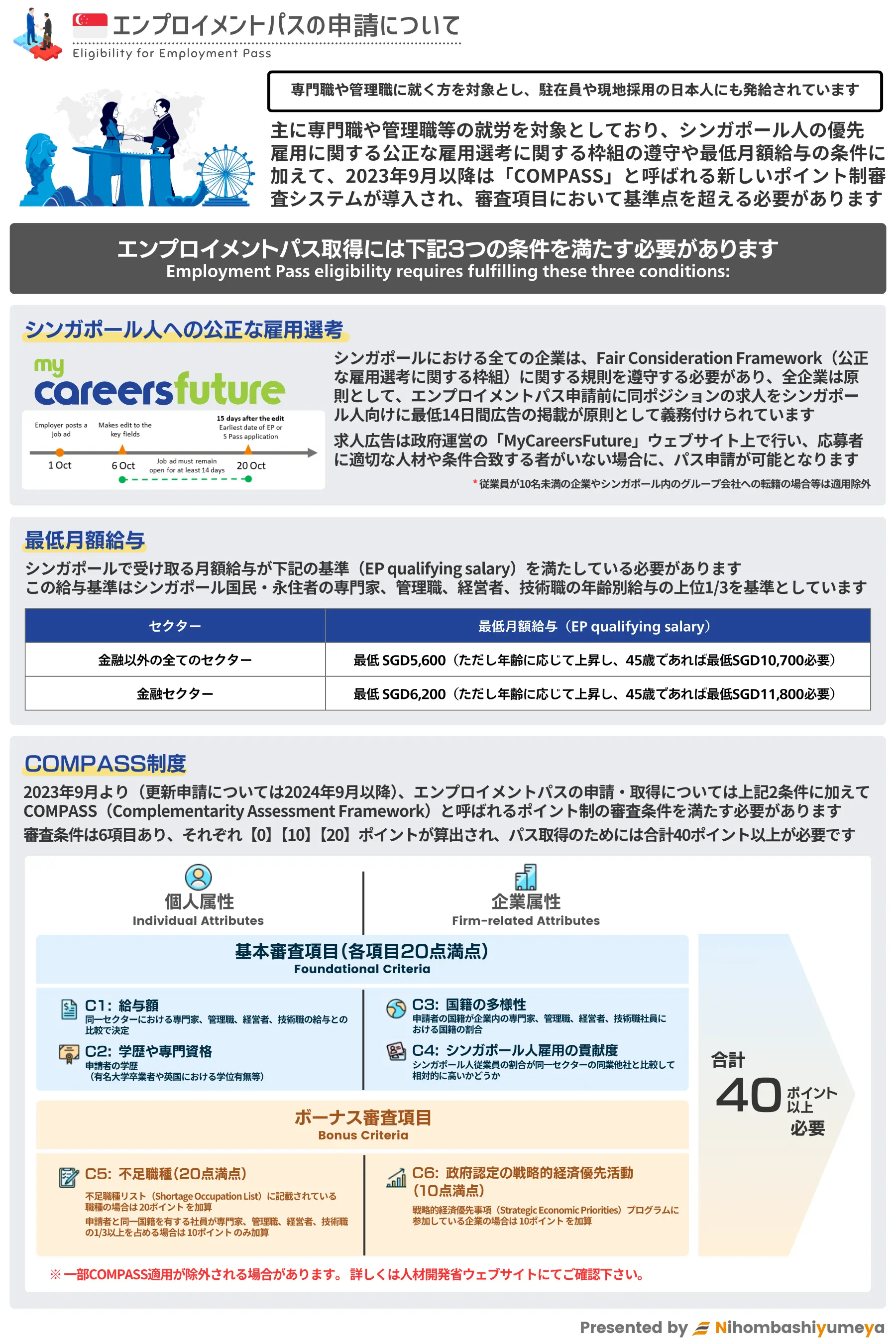 なお、駐在員や現地採用等で就労にあたって概ね取得が想定される エンプロイメントパス(EP: Employment Pass)の新規申請については、2023年9月以降、COMPASS(Comlementarity Assessment Framework)と呼ばれるポイント制審査システムに移行されており、6つの審査項目の合計ポイントが40ポイント以上であることが必要条件とされています。