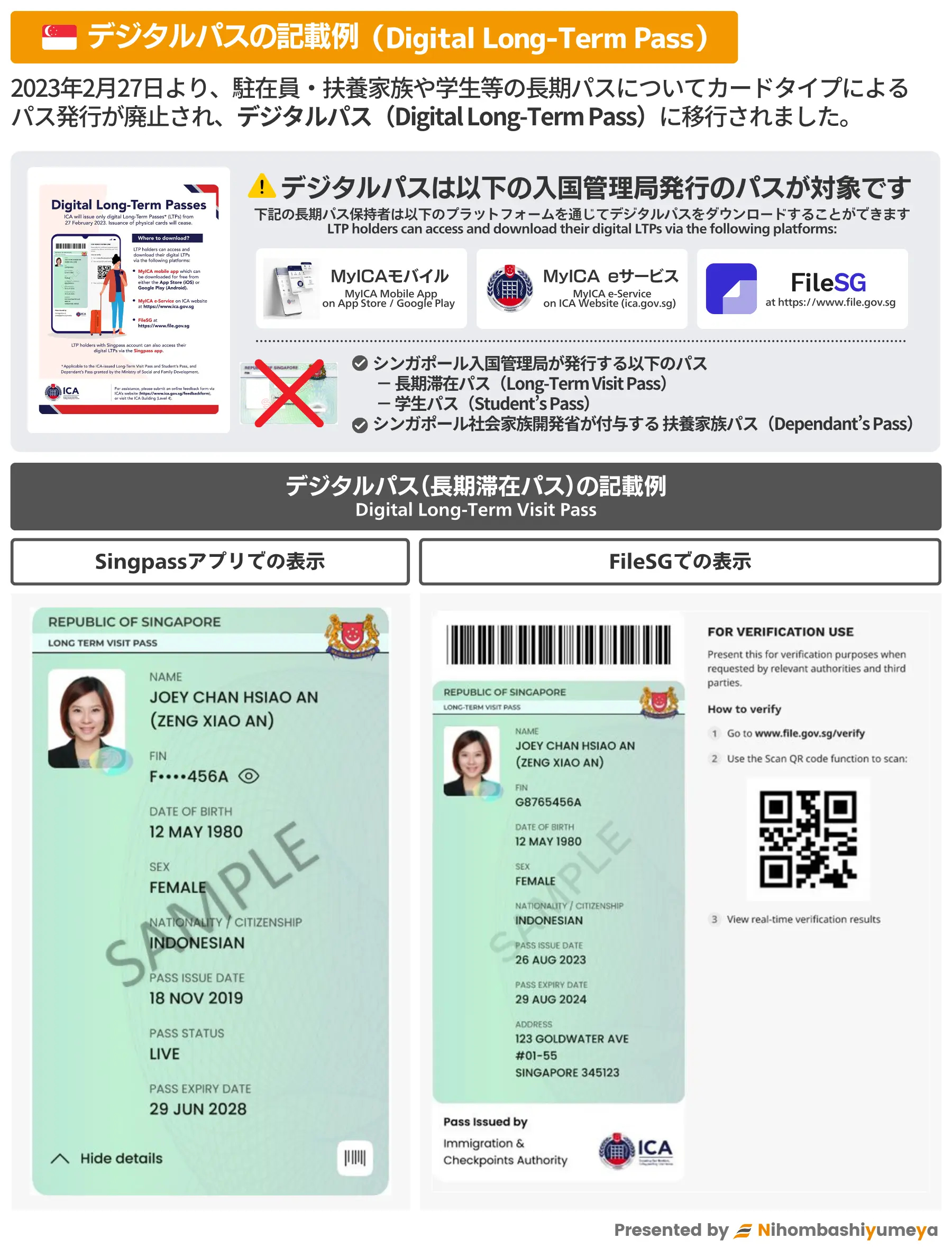 2023年2月27日以降、シンガポール入国管理局発行の長期訪問パス(LTVP)、学生パス(SP)及び 社会家族開発省が付与する扶養家族パス(DP)について、物理的なカード型タイプのパス発行を廃止し、デジタルパス(Digital Long-Term Pass)のみの発行に変更されました。