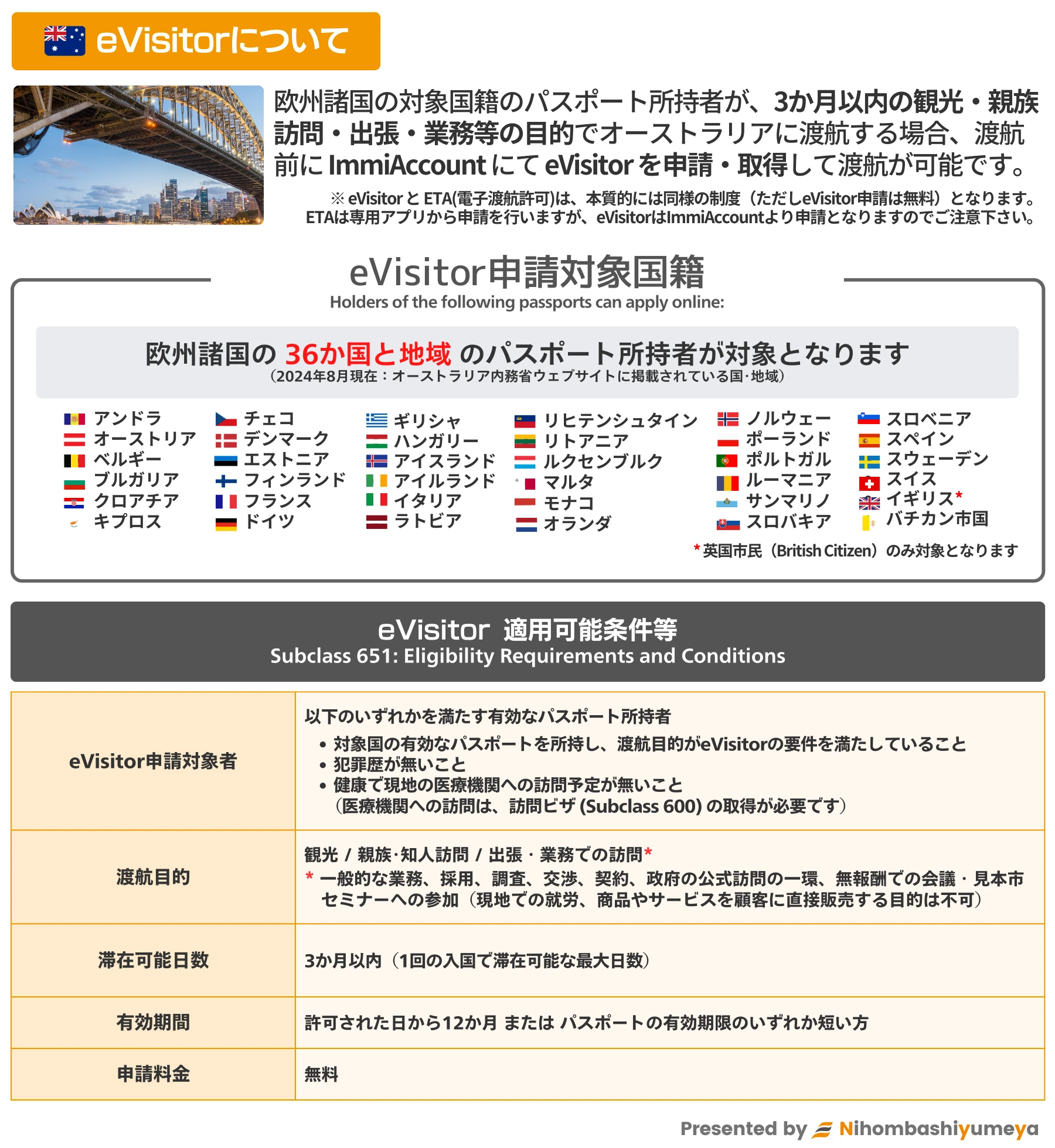 欧州のパスポート所持者は、ETA同様の電子ビザ eVisitor(Subclass 651)を申請可能な場合があります