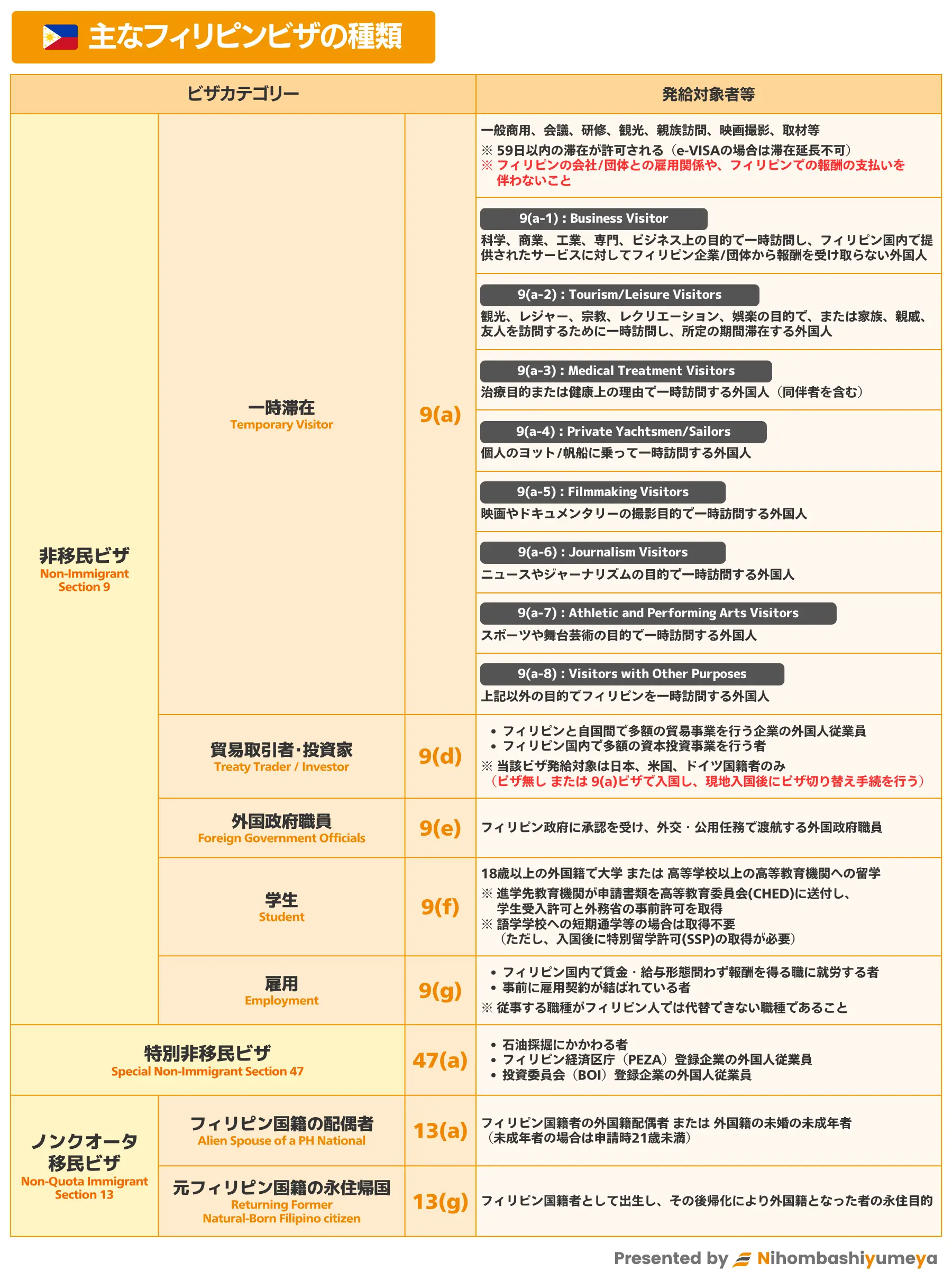 対象の日本在住の外国籍の方、観光・ビジネス目的でビザ免除の30日間を超えてフィリピンに一時滞在する日本国籍の方も、e-VISAで一時滞在ビザ(9(a))を申請することが出来ます。
