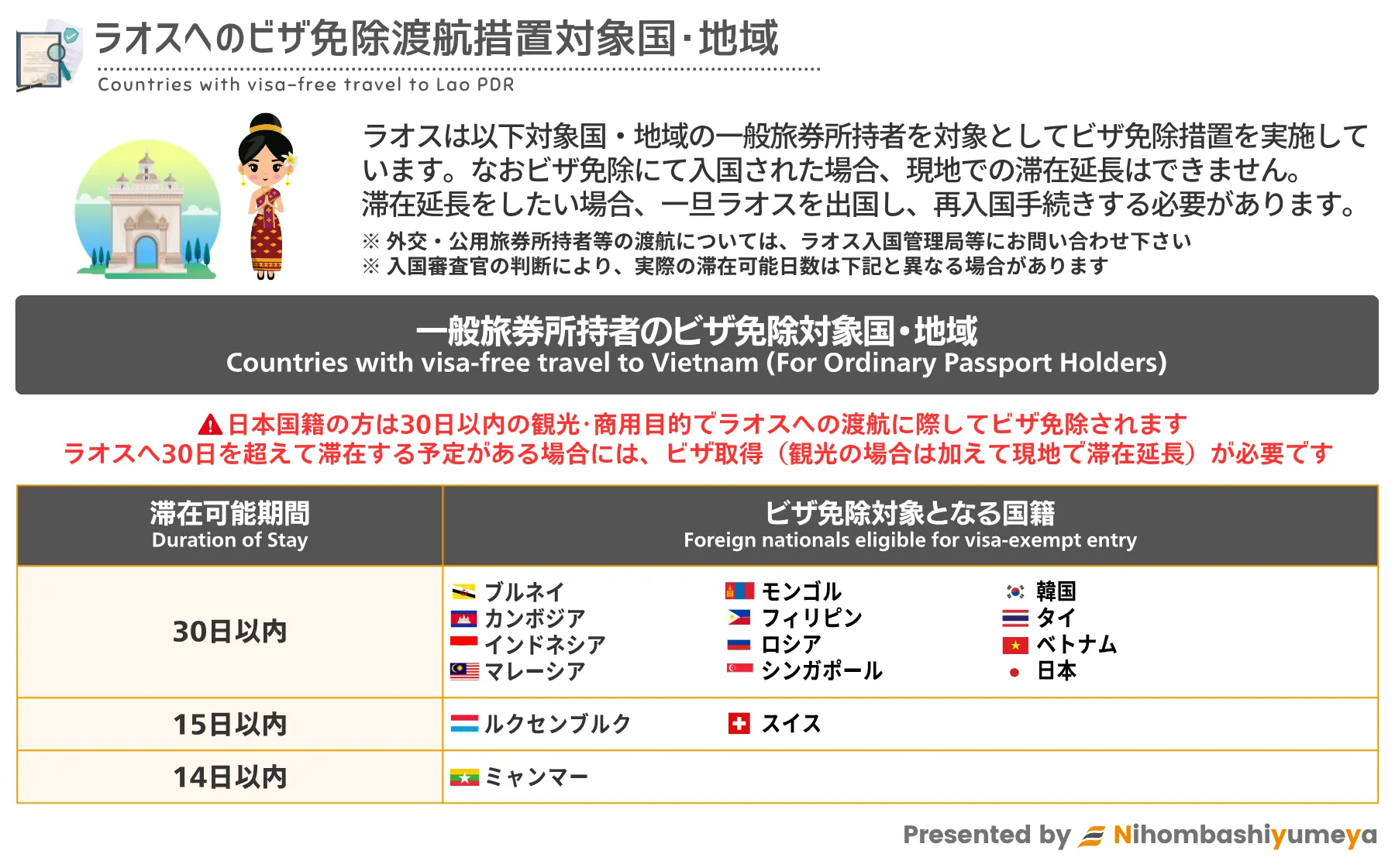 手続きや規則等に関する最新の情報については、ラオス入国管理局、在日ラオス大使館にお問い合わせください。