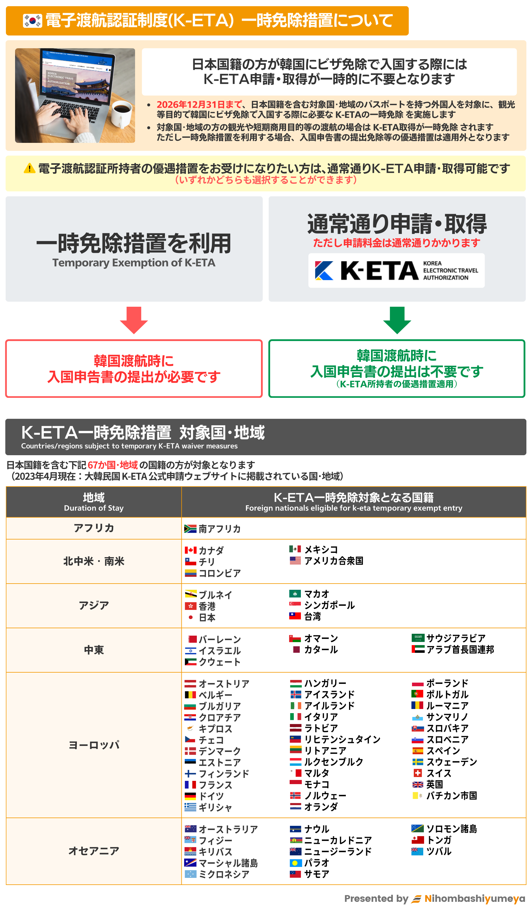 K-ETAの申請義務の適用免除について 韓国政府は2023年4月1日~2026年12月31日まで、日本を含む対象国・地域の国籍の方の韓国渡航については、一時的にK-ETAの適用を免除しています。ただし、韓国入国時の入国申告書作成等のK-ETA取得者の特典を受ける場合は、K-ETAの申請が必要です