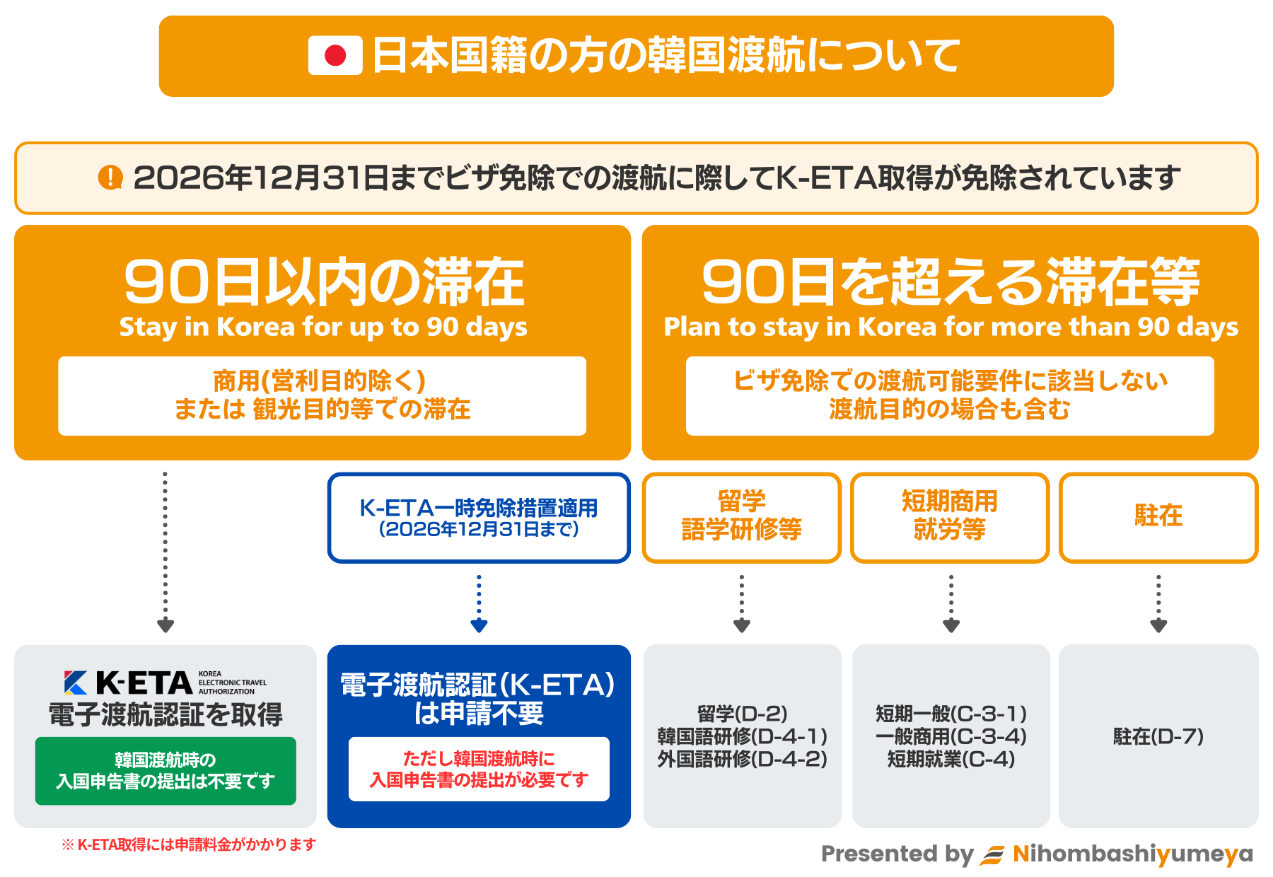 これにより、ビザ免除での滞在が可能な目的での日本国籍の方の韓国渡航については、K-ETA申請・取得は不要です。